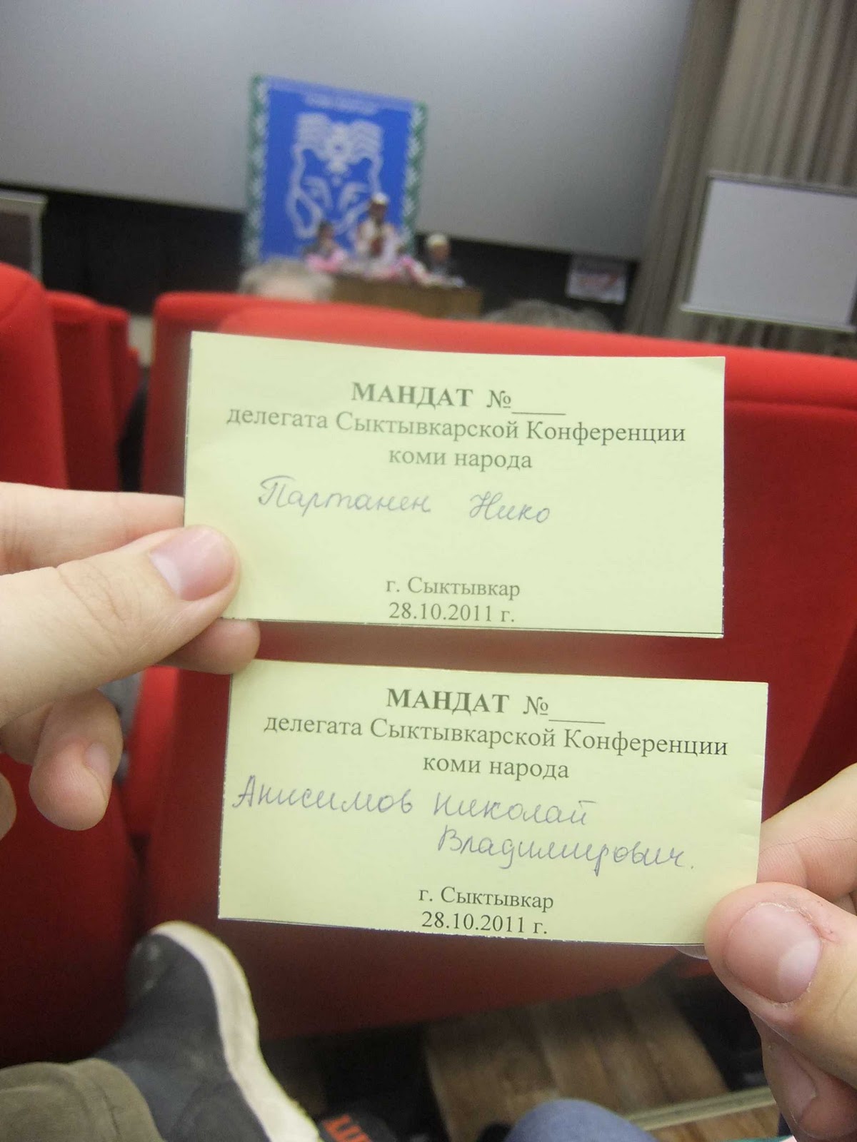 Olin mennyt paikalle vain katselemaan, mutta lopulta kävikin niin, että minä ja Nikolai Anisimov saimme omat äänestyslippumme. Tietysti joku voi kysyä, minkä takia suomalainen ja udmurtti ovat komien kokouksessa mandaatit ojossa, mutta me mietimme, ettemme ainakaan mitään haittaa aiheuta. Periaatteessa on muuten hyvin mielenkiintoinen kysymys, kuka on oikeutettu äänestämään komien tilaisuuksissa. Kuten on nähty, ei tämä saamelaisten tai muidenkaan alkuperäiskansojen kohdalla ole mitenkään selvää.