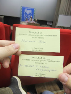 Puhujia oli paljon, ja suurin osa puheenvuoroista oli komiksi. Tämän takia konferenssi oli hyvin mielenkiintoista seurattavaa, vaikka aivan kaikkea en pystynytkään ymmärtämään. Konferenssin tauon aikana oli myös suurimuotoisempi äänestetys Komi Vojtyrin edustajista, ja mielestäni näihin vaaleihin liittyvät käytännöt tuntuivat varsin demokraattisilta ja normaaleilta, mitä niitä sivusta seurasin. Paikalla oli myös tasavallan presidentti Vjatšeslav Gaizer. Hän tosin poistui paikalta jo kolmen tunnin jälkeen, itse konferenssihan jatkui pitkälle iltaan.