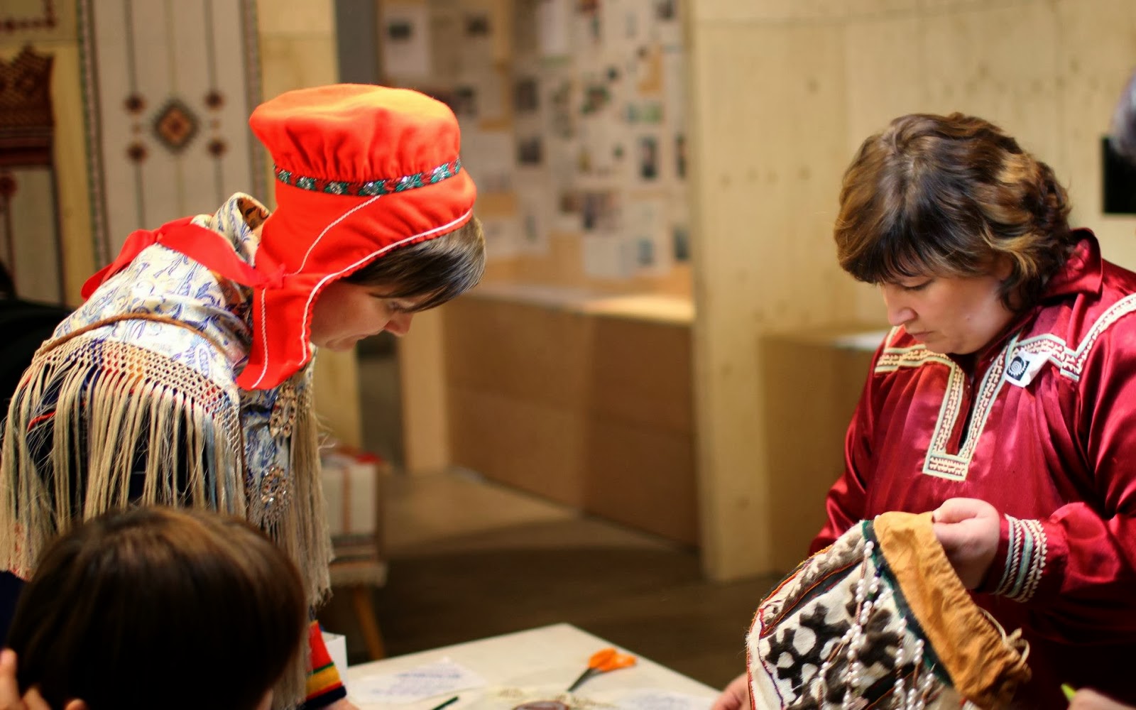 Korutaiteilija Inka Laiti tutustumassa hantilaiseen käsityökirjailuun Finno-Ugric Design -tapahtumassa Helsingissä lokakuussa 2012. Kuva: Tuomo Launonen.